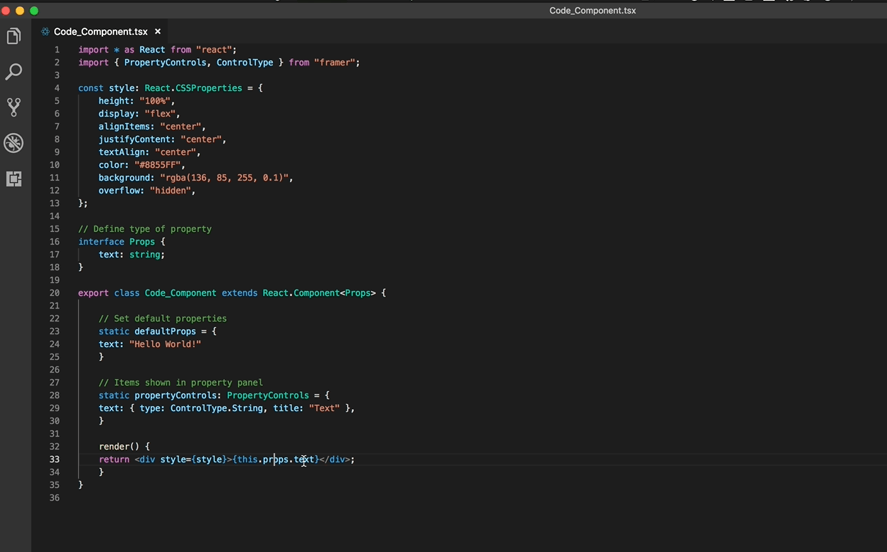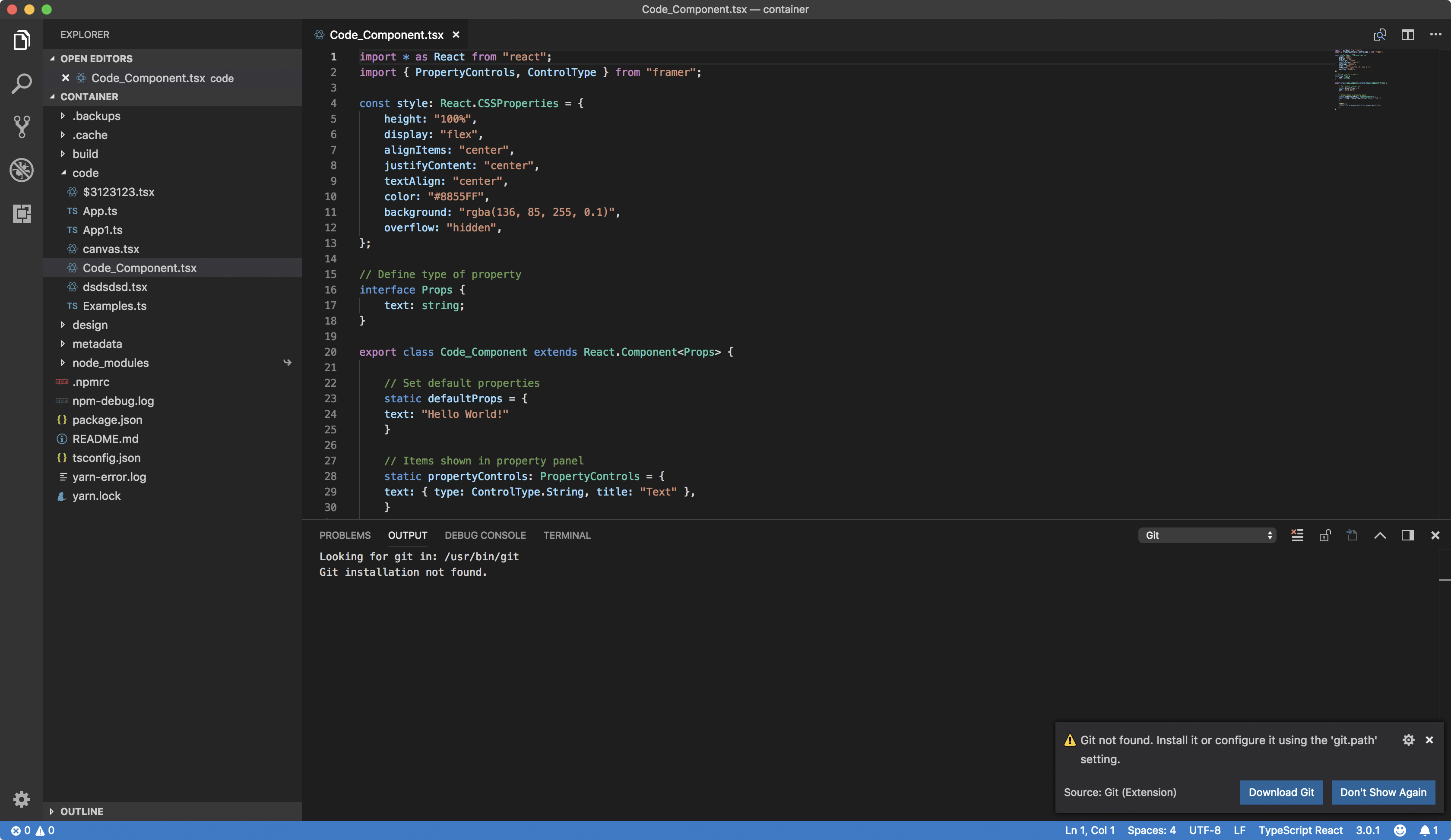 Для создания компонента при помощи кода Framer X отправляет нас в Visual Studio, где открывается заготовка компонента.