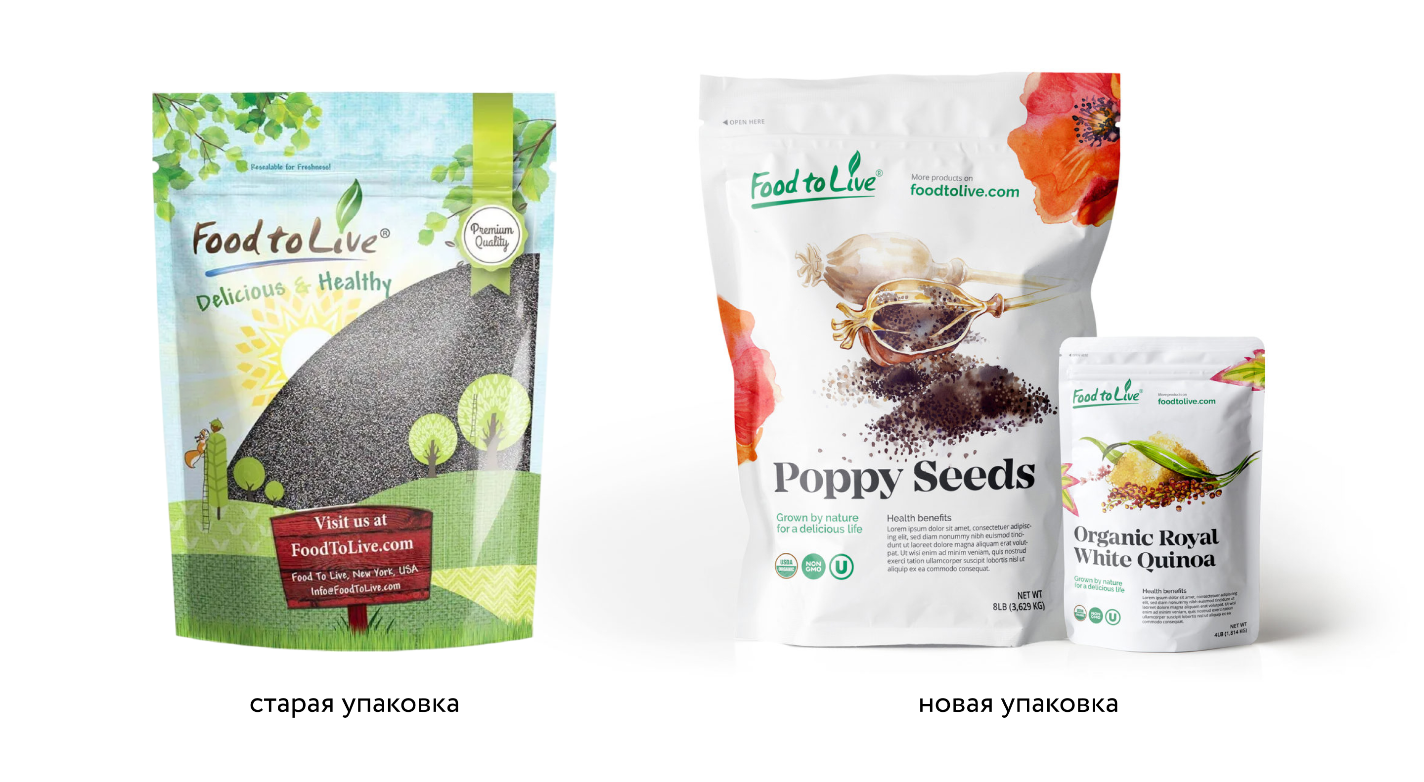 На старой упаковке было чересчур много элементов, которые спорили друг с другом. Из-за этого она терялась среди других на онлайн-витринах. Поддерживаем идею органичности: упрощаем упаковку, наводим порядок в структуре элементов и помещаем иллюстрации на белый фон.