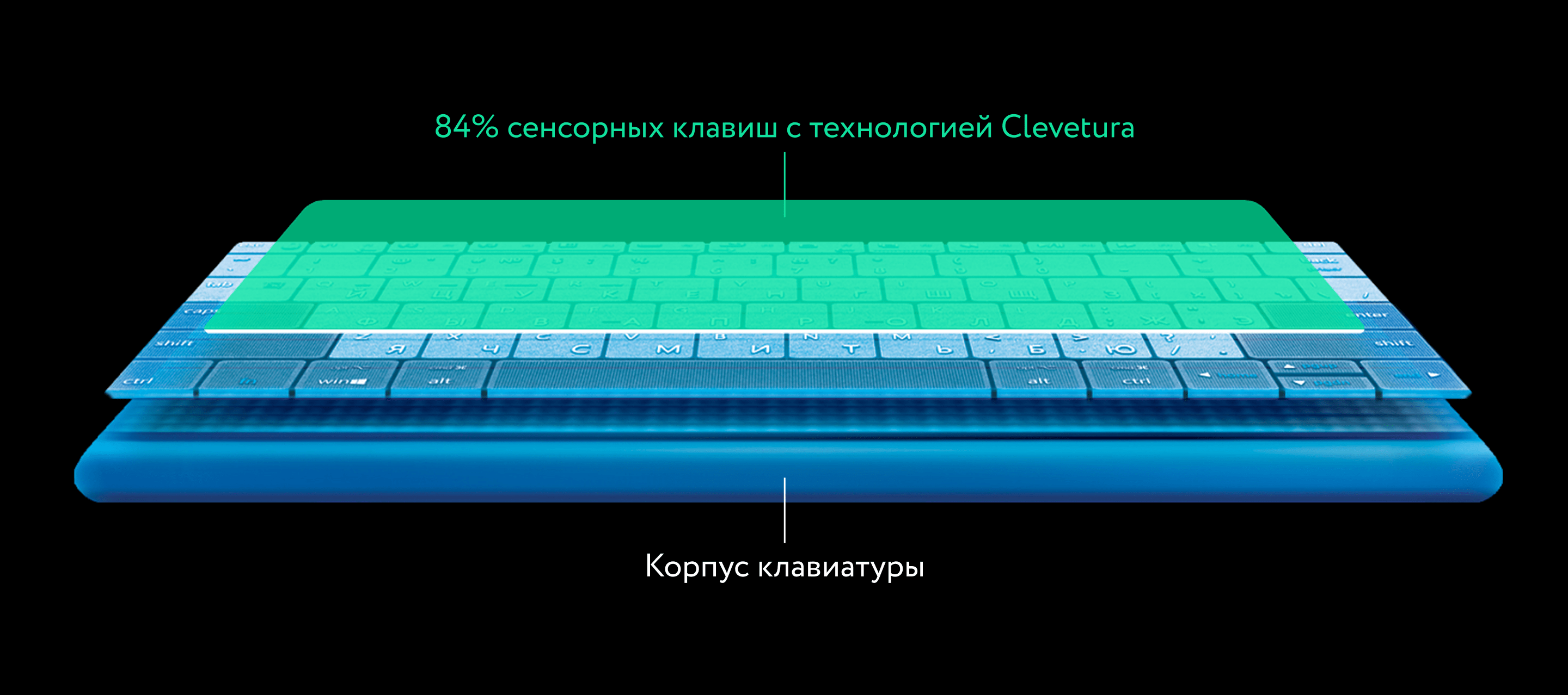 Клавиатура с Clevetura выглядит обычно, но внутри у нее ✨волшебство — сенсор с продвинутой логикой обучения. Он расположен внутри клавиш и распознает жесты пользователя: нажатия, скролл, тапы и клики.