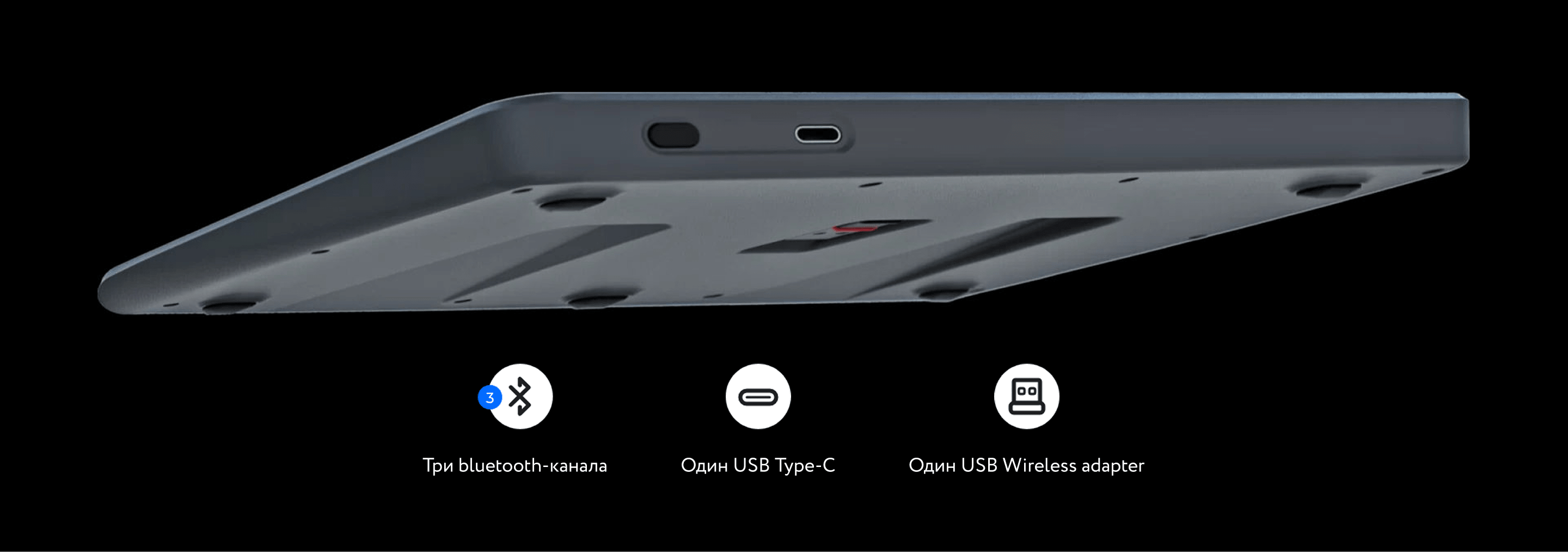 Клавиатура подключается к 5 устройствам одновременно: три — через Bluetooth, два других — через Radio USB и USB-провод.