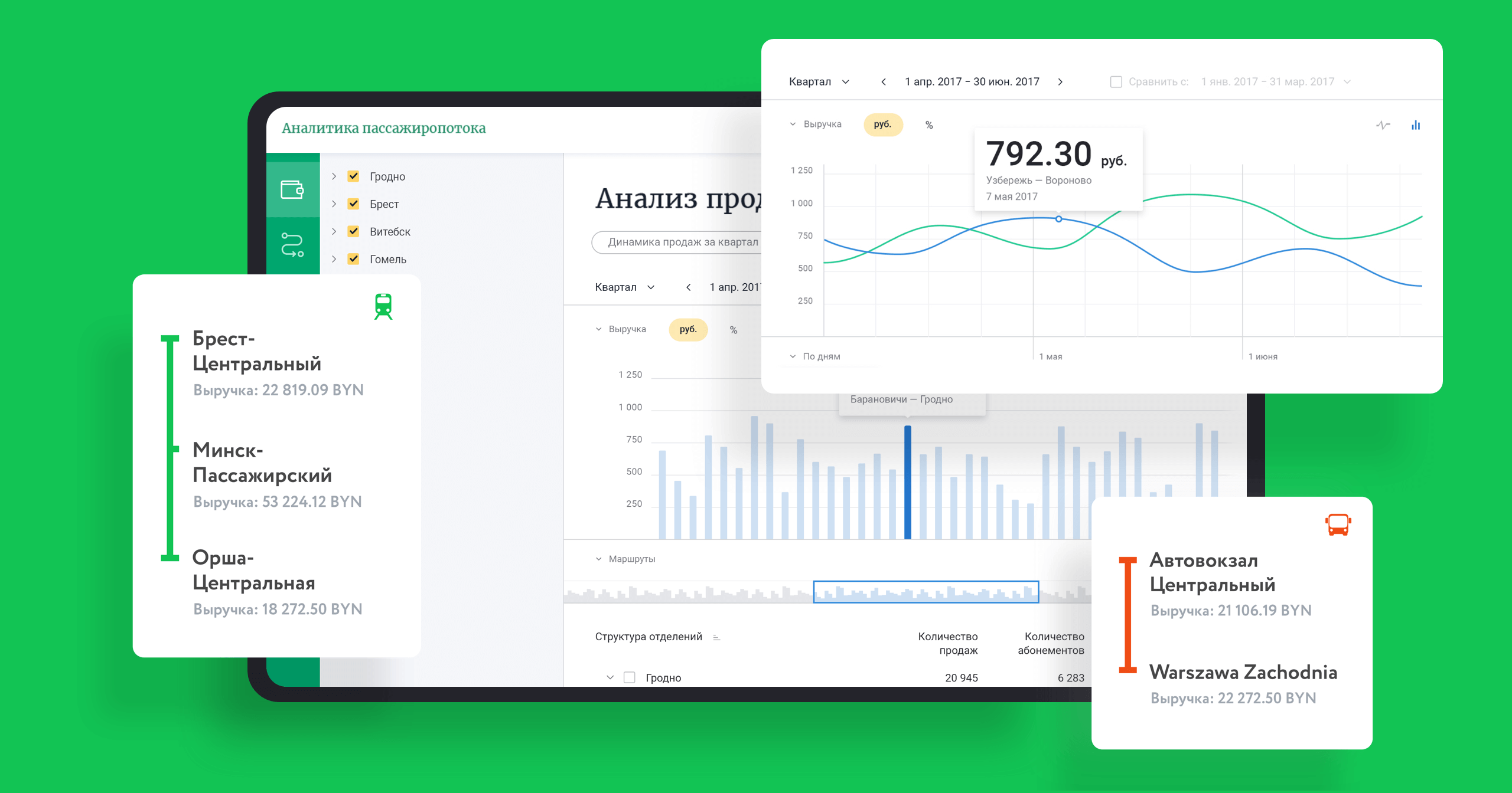 Сначала пользователь выбирает, что анализировать: деньги или трафик. Далее идет структурированный каталог всех существующих маршрутов. Можно работать с информацией по отдельным населенным пунктам, маршрутам и целым областям.