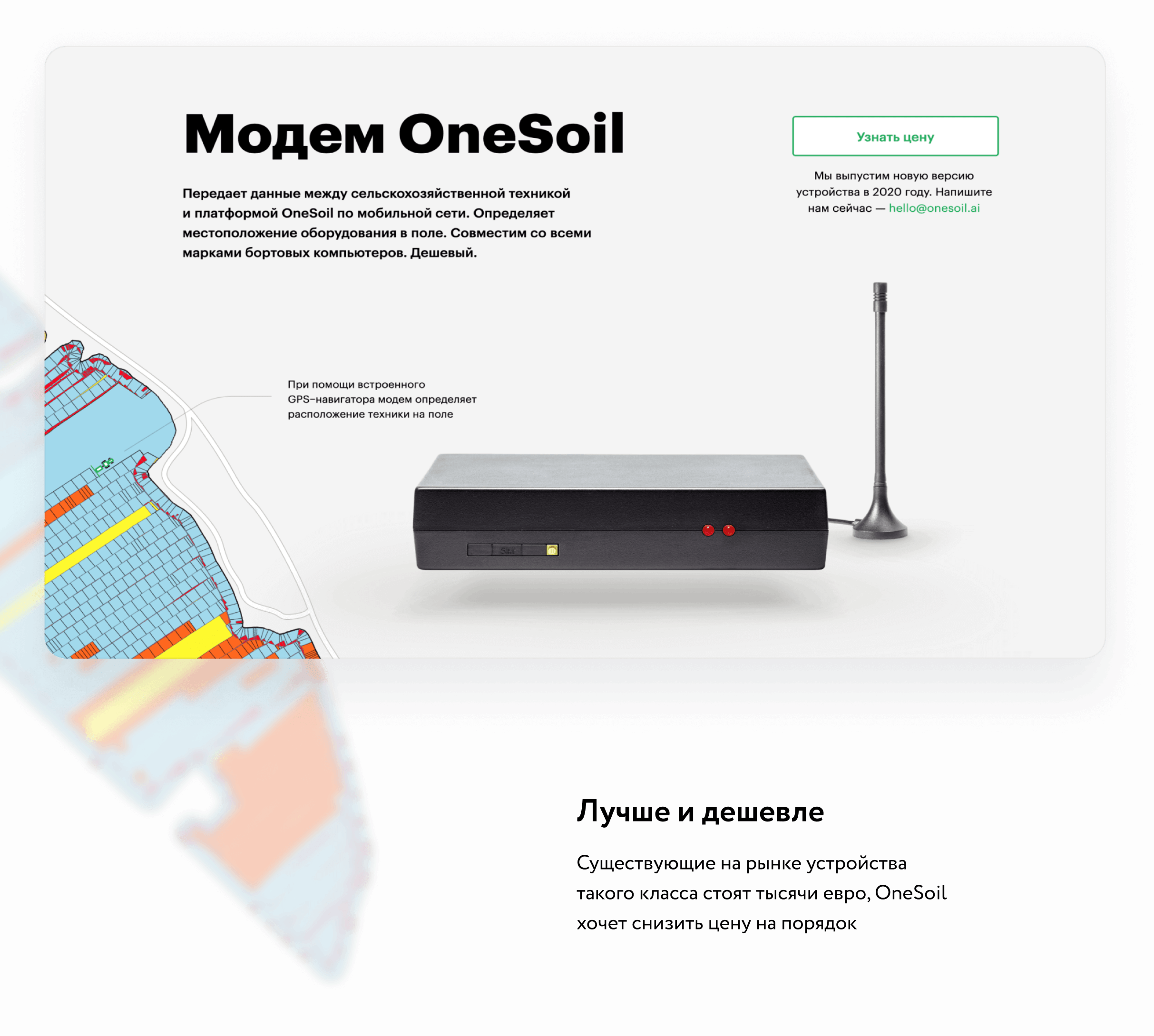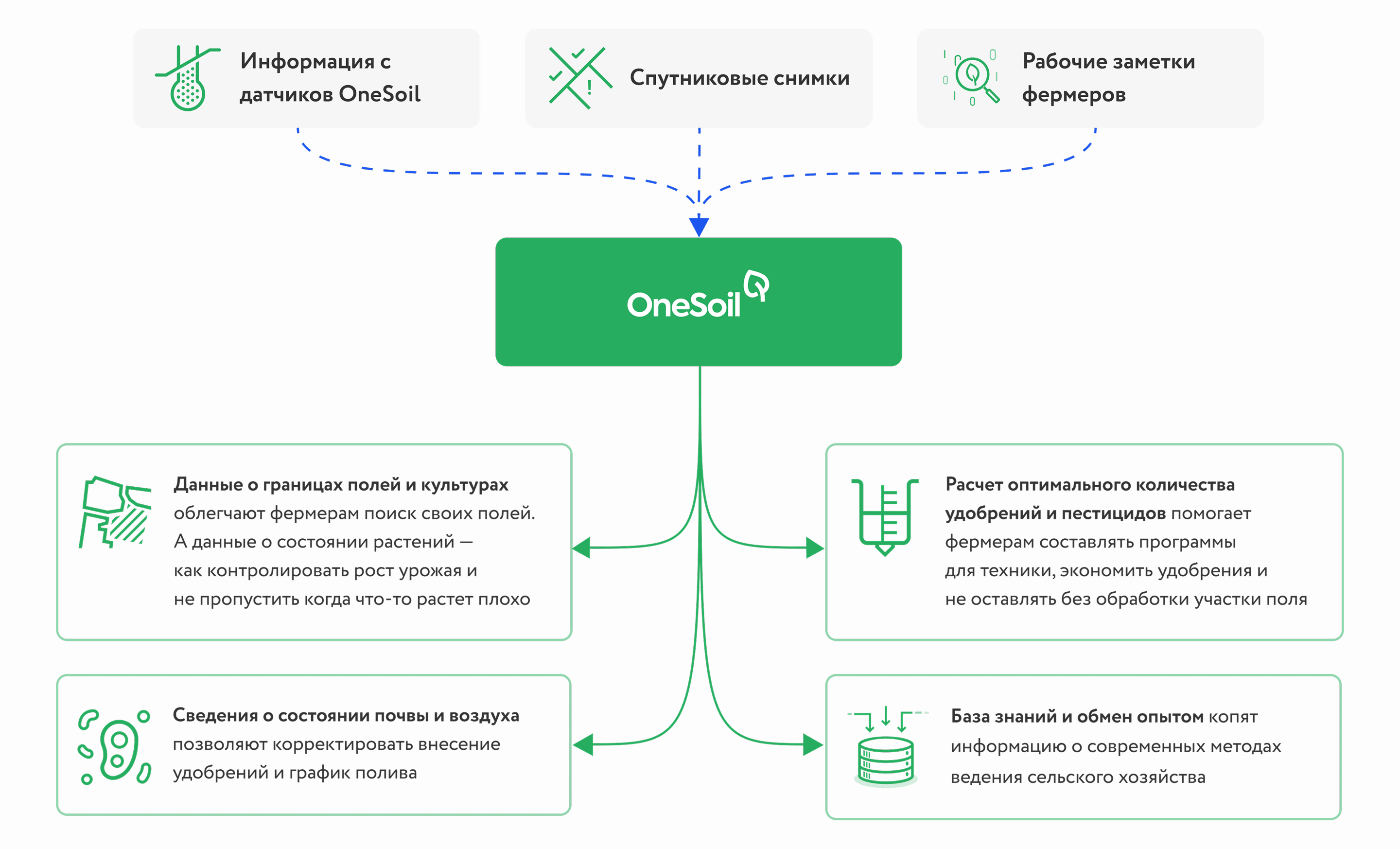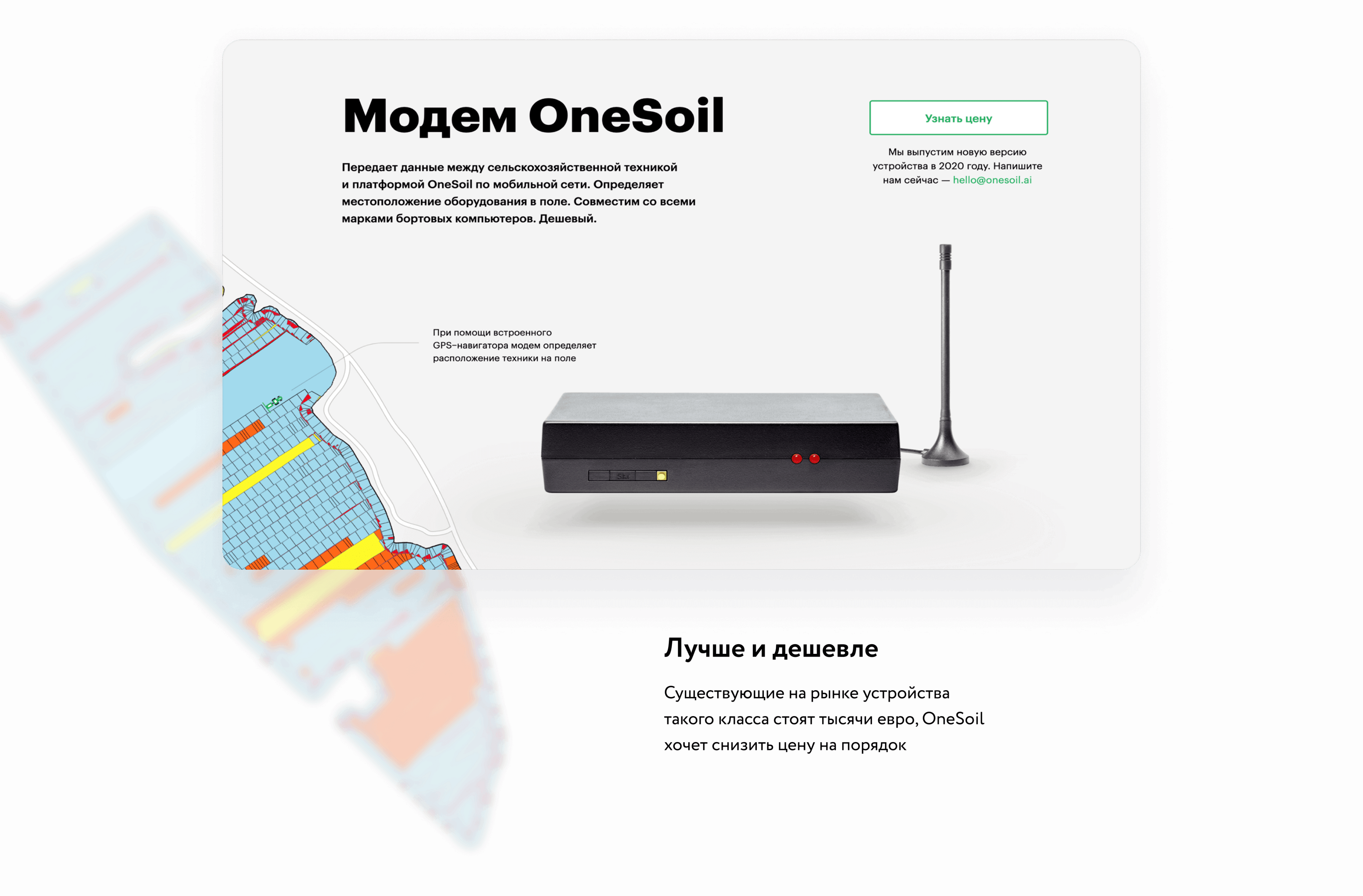 OneSoil — комплексное решение, которое включает в себя приложения и устройства: модем и метеостанцию. Гаджеты помогают фермерам лучше понимать, что происходит с почвой и точнее управлять техникой для внесения удобрений. Датчики отправляют больше точных и актуальных данных с полей в облачную платформу OneSoil, что улучшает аналитику и прогнозы.