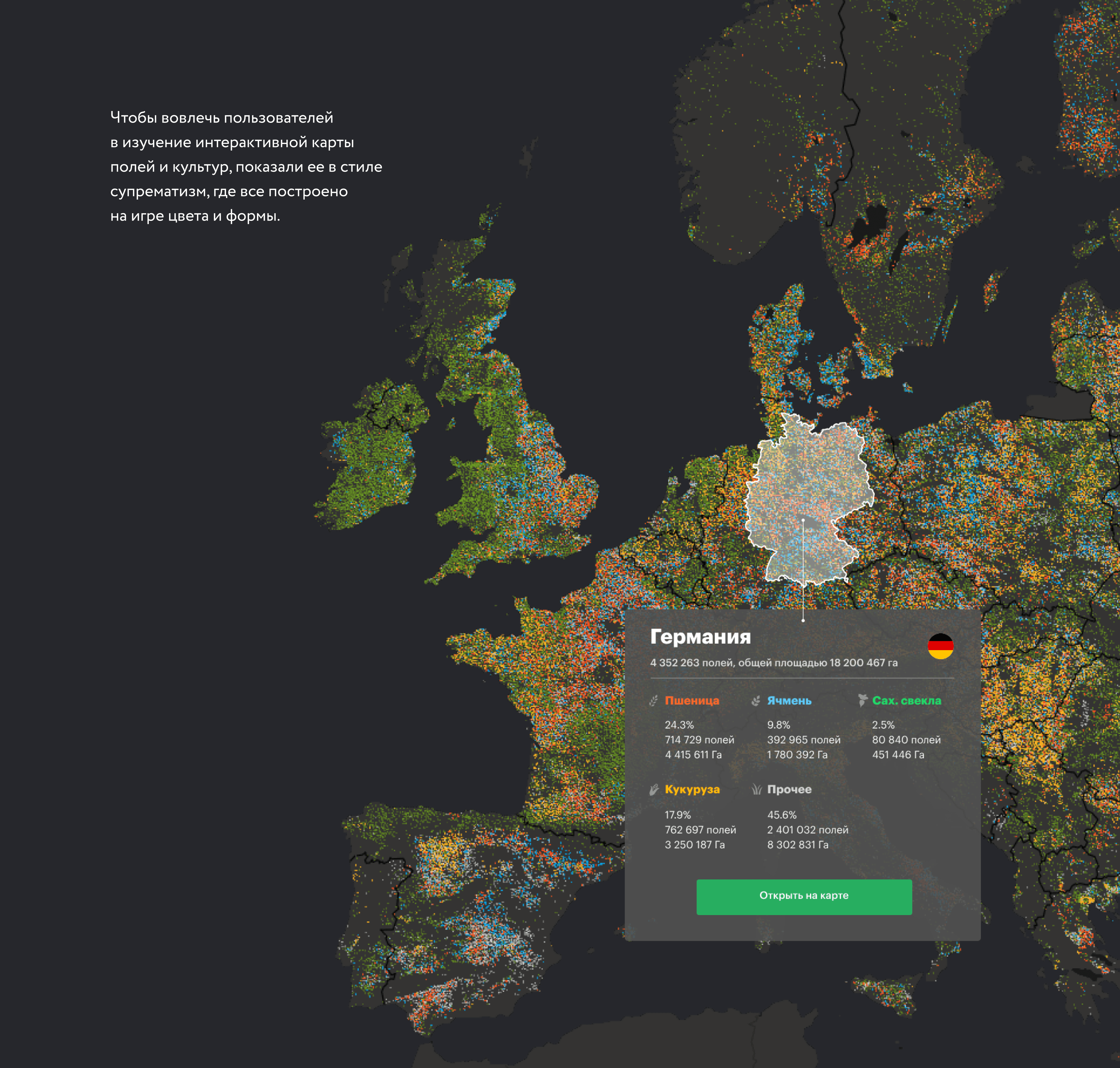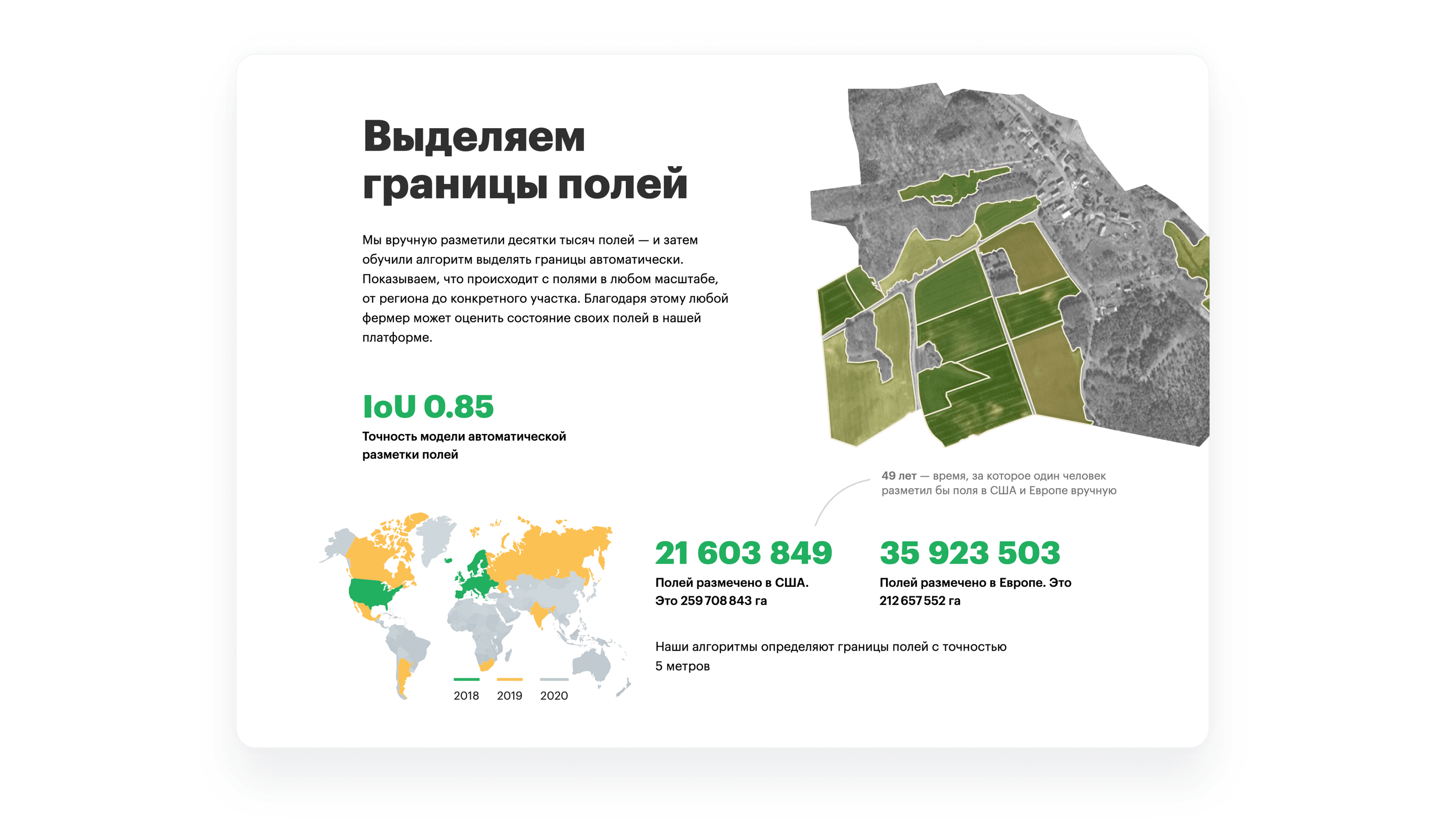 OneSoil делает крутой продукт и умеет бодро о нем рассказать. Проект мировой карты сельхозкультур вызвал большой резонанс: полторы тысячи лайков на Product Hunt, пост у Артемия Лебедева и бронза в категории карт на конкурсе визуализаций Information is Beautiful Awards 2019.