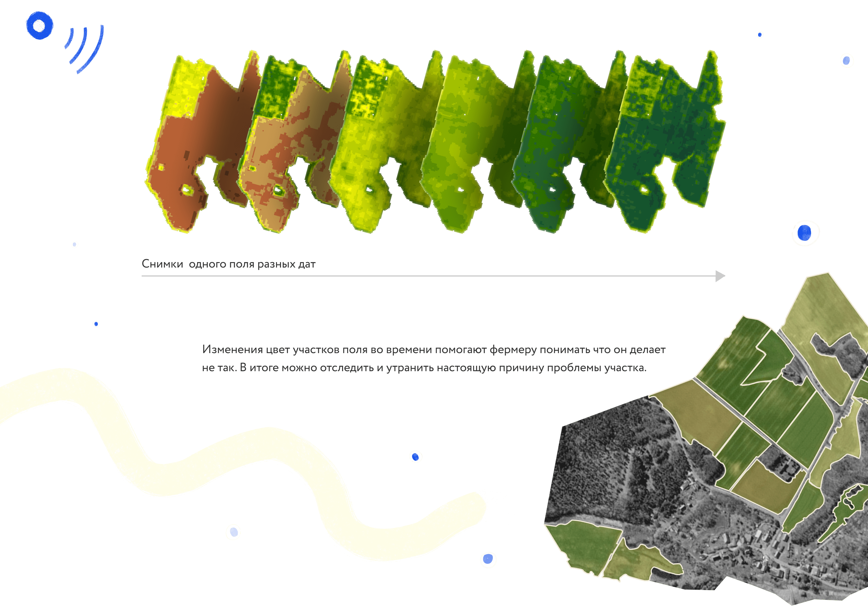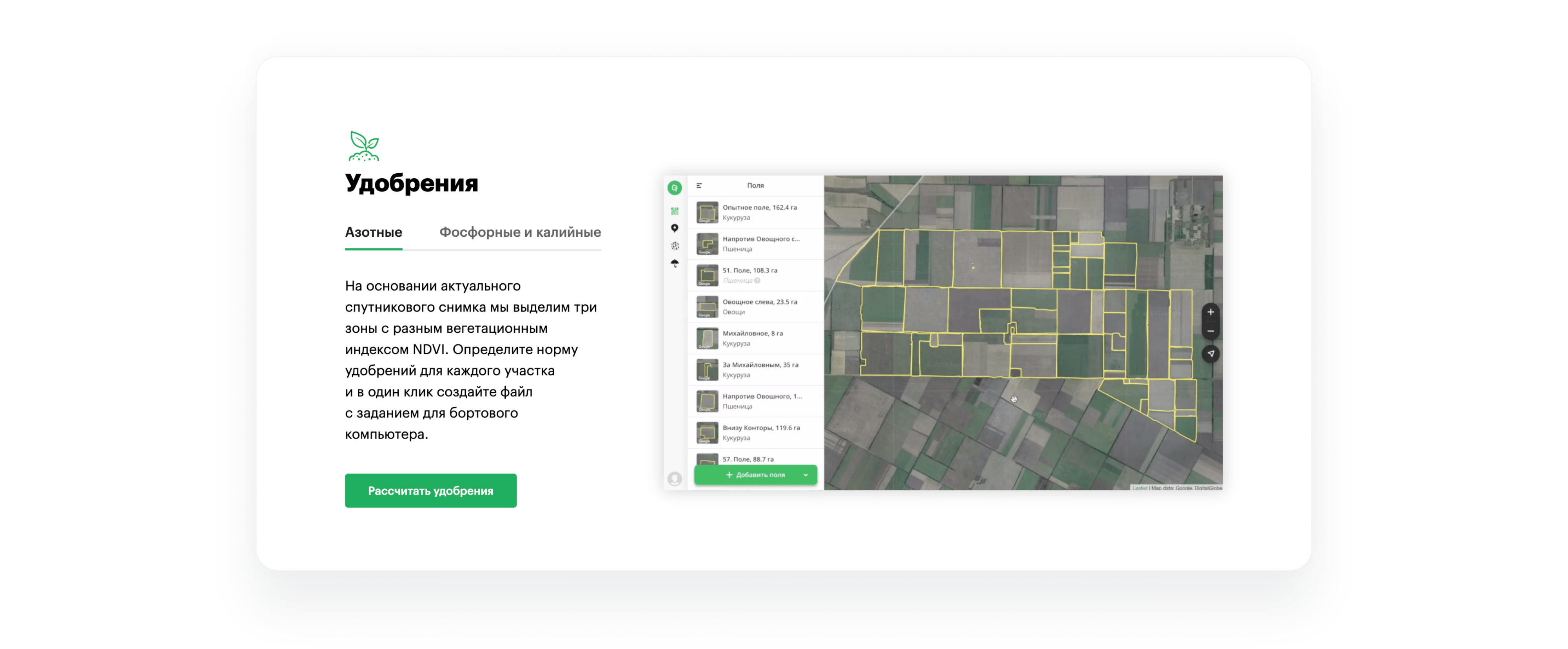 С помощью индекса NDVI, система подсказывает дозировку удобрений, необходимых для разных участков поля. Фермер прямо на карте своего хозяйства видит текущую картину: в зеленых зонах все хорошо, в желтых — надо добавить.