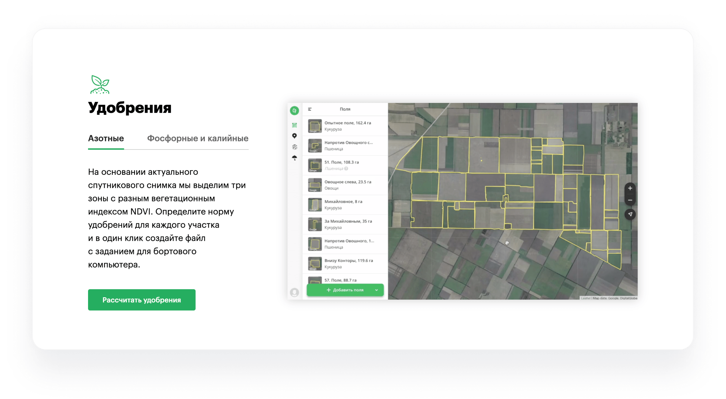Платформа помогает контролировать состояние посевов с помощью NDVI — нормализованного вегетационного индекса. Это показатель здоровья растения, который определяется по тому, как растения поглощают свет.