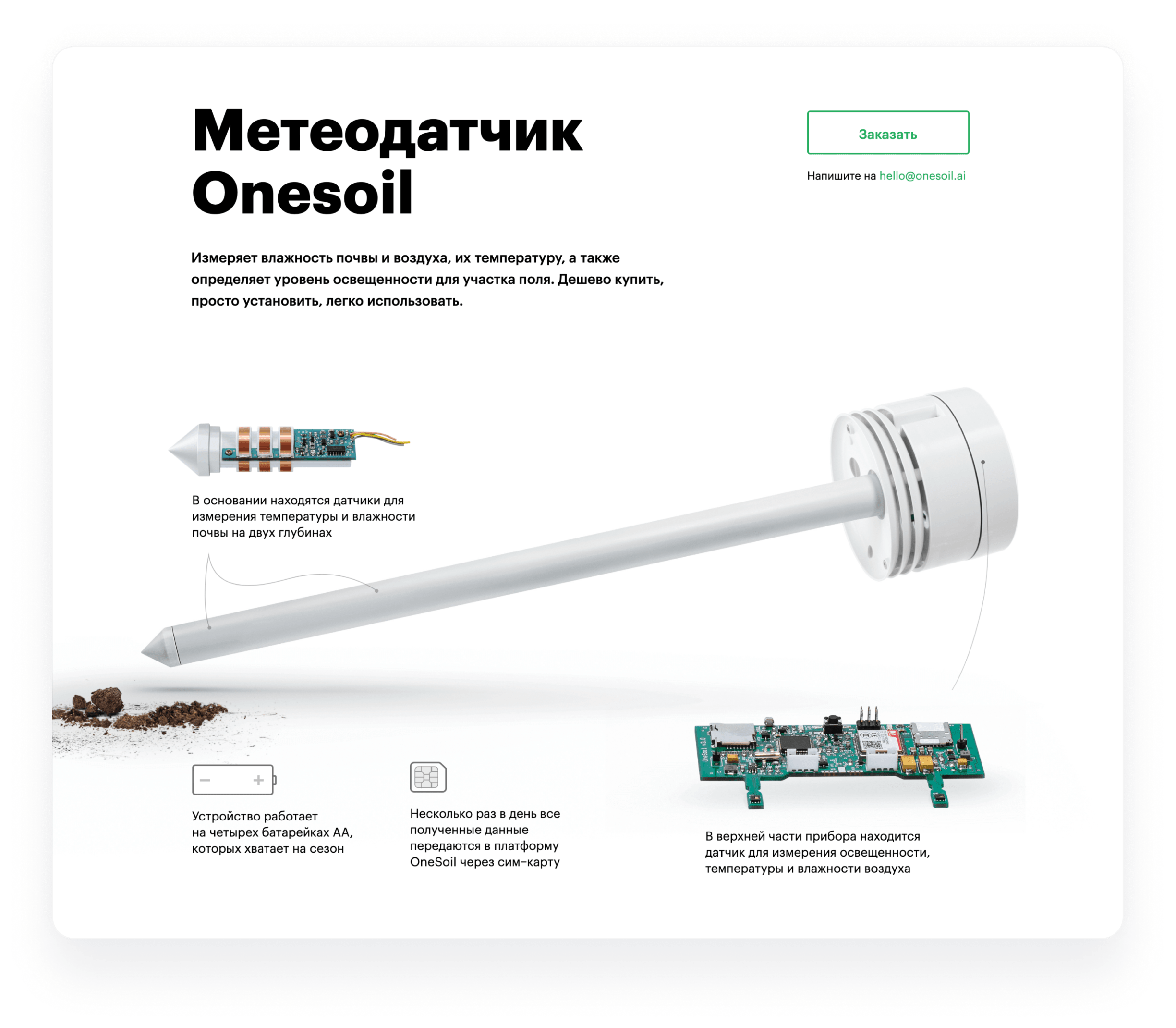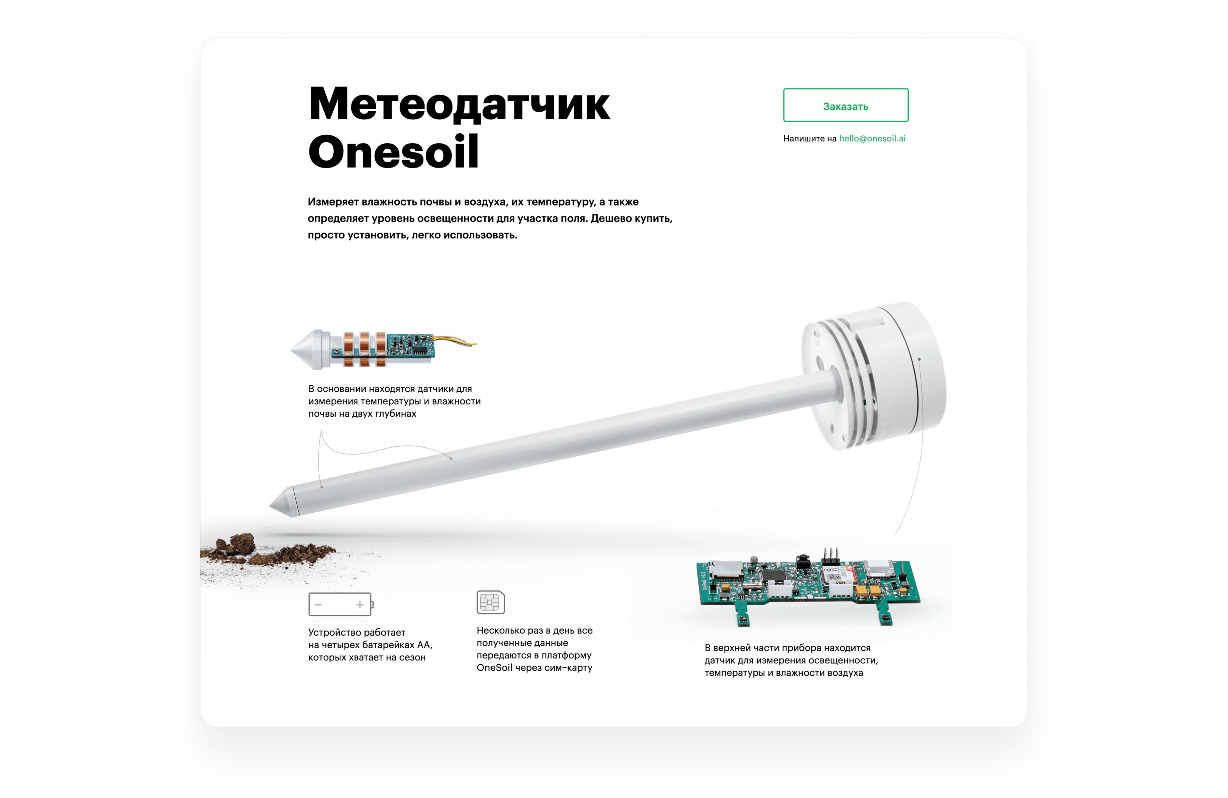 Устройства — собственная разработка инженеров компании OneSoil. Чтобы привлечь внимание пользователей приятными деталями, мы крупно показали гаджеты в разобранном виде.