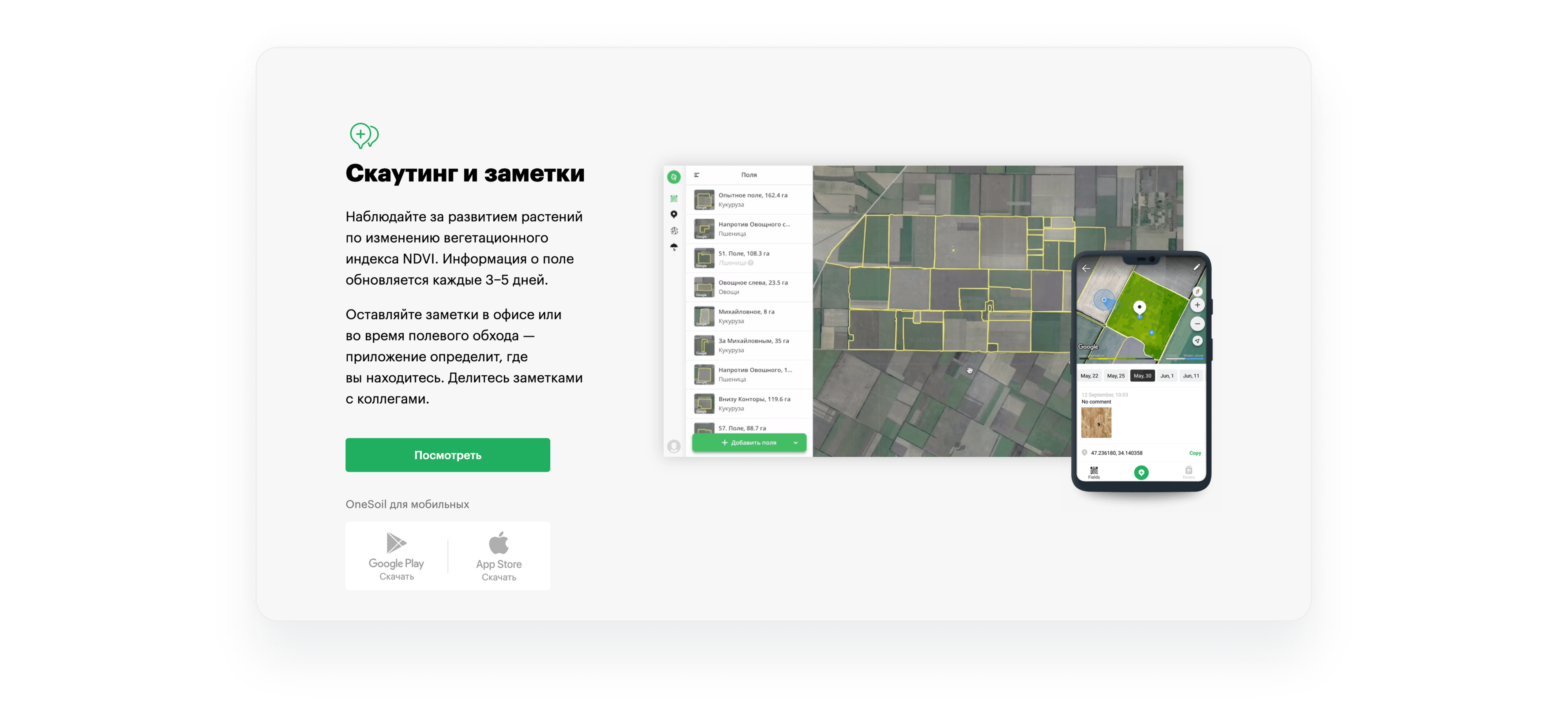 Самое мощное в платформе OneSoil — нейросеть, обученная на десятках тысяч образцов. Система умеет анализировать данные, полученные со спутников, с датчиков в полях и внесенные вручную. В результате автоматически определяются границы полей, произрастающие на них культуры и фазы роста растений. Это уже сейчас выглядит круто, но в скором будущем будет вообще огонь — продвинутое прогнозирование: болезней, урожайности или нашествия вредных насекомых.