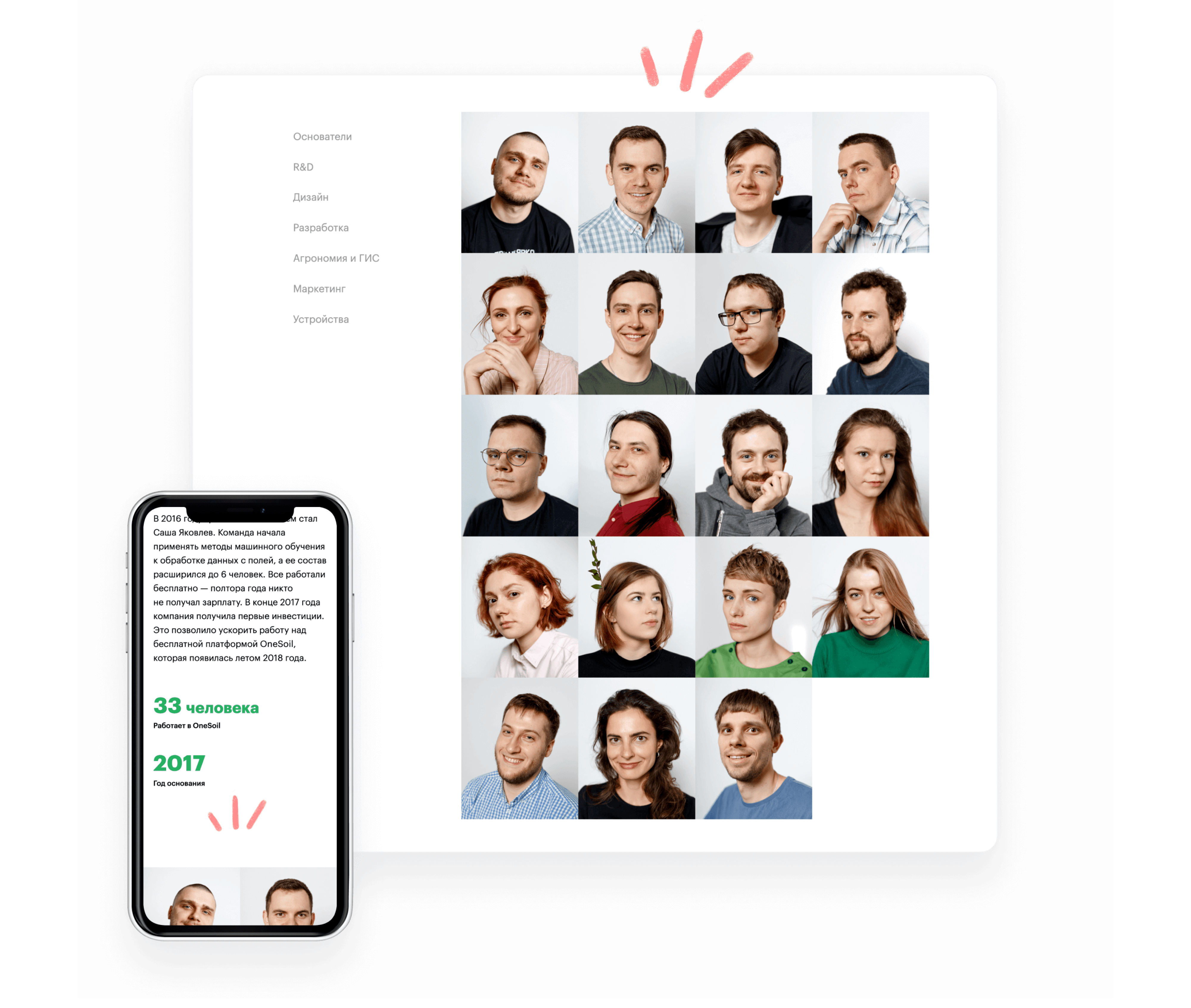 Инвесторам важны не только технологии, но люди, работающие в проекте, поэтому завершаем рассказ про OneSoil историей компании, показываем ее структуру и лица сотрудников.