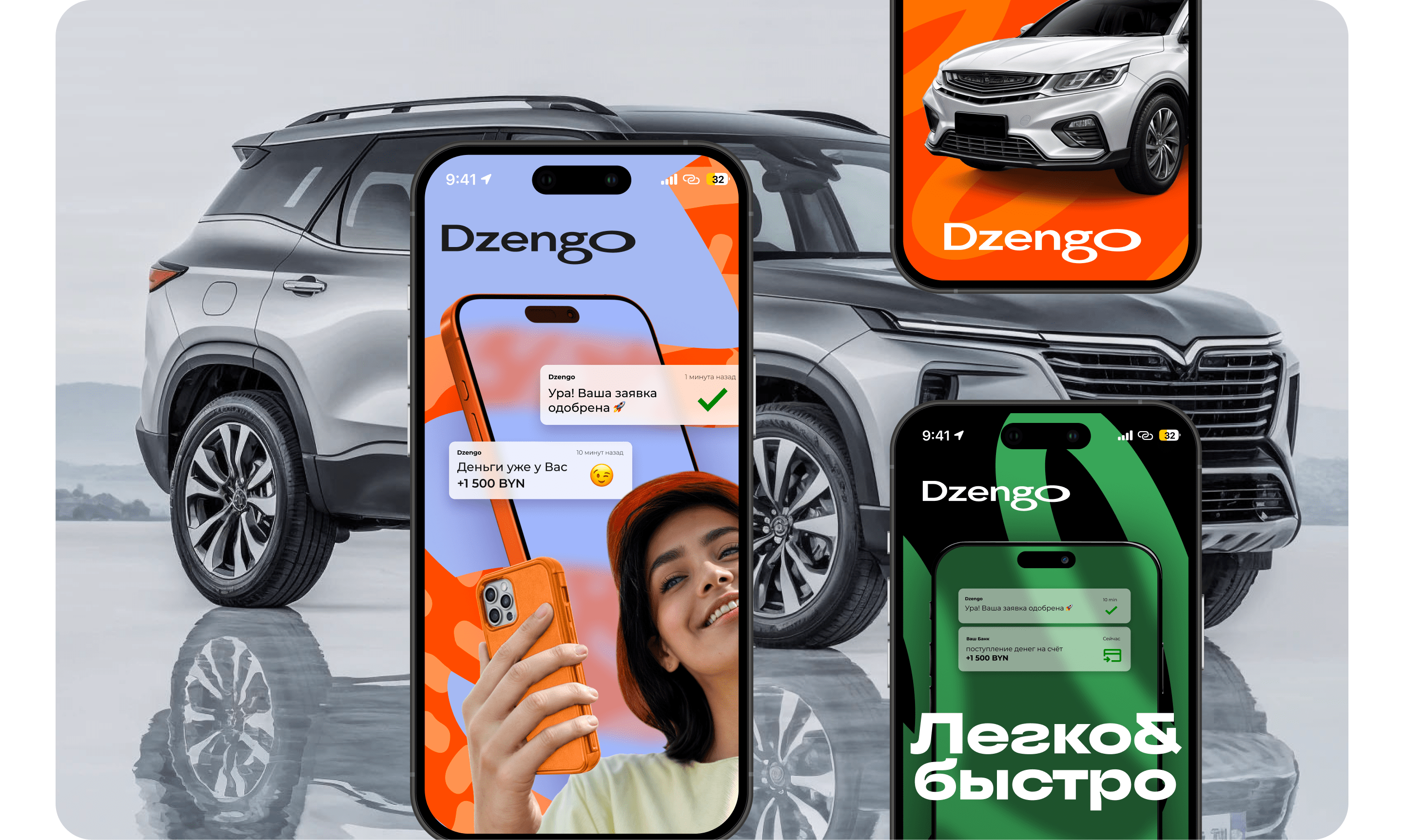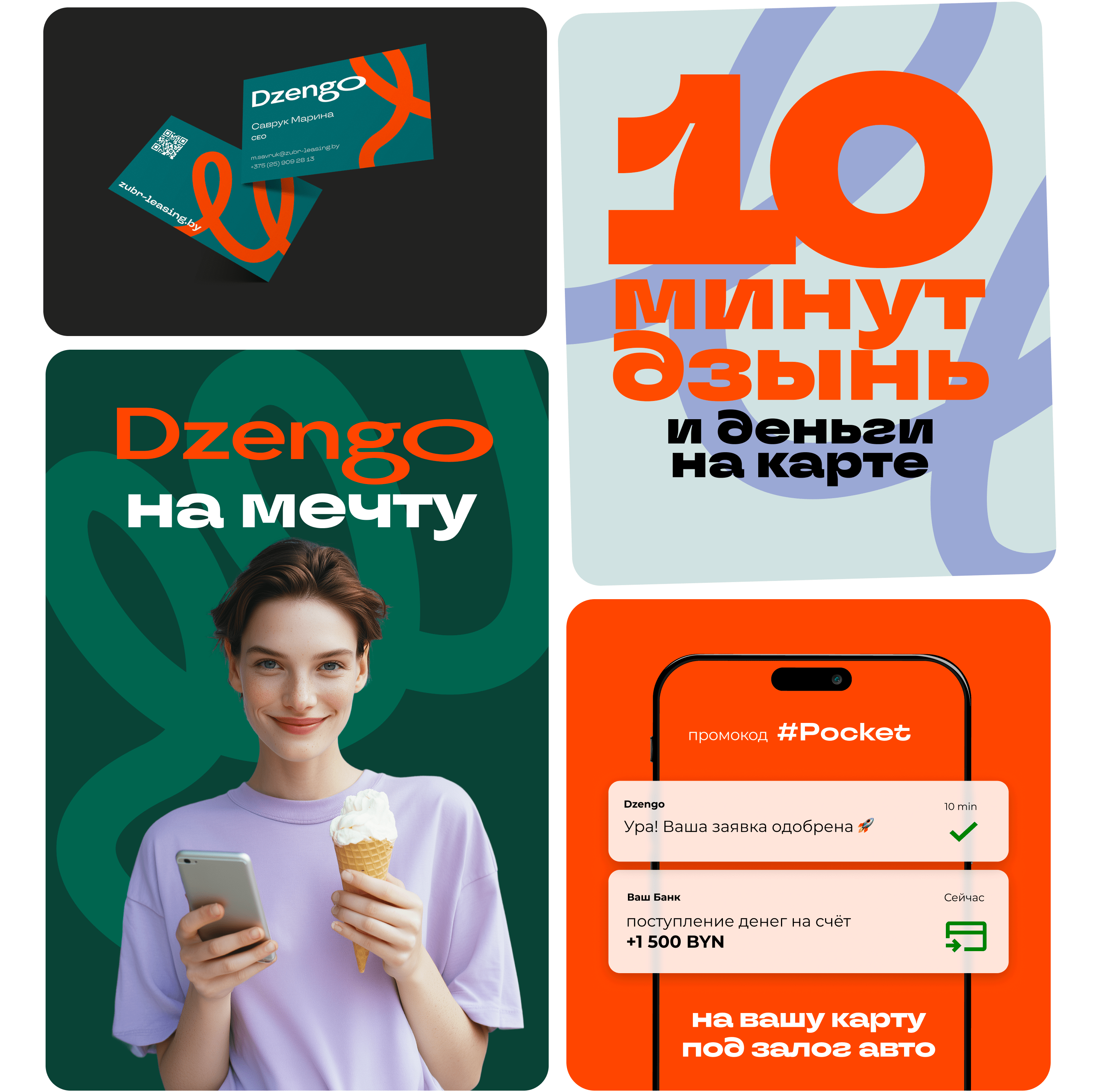 Поскольку Dzengo — это 100% онлайн-продукт, мы вынесли элементы цифрового интерфейса прямо в айдентику. Плашки в виде пуш-уведомлений, сообщений из мессенджеров и системных алертов («Ура! Ваша заявка одобрена», «Деньги уже у Вас») стали главным паттерном коммуникации. Это подчеркивает суть сервиса — все решается в смартфоне за 15 минут.