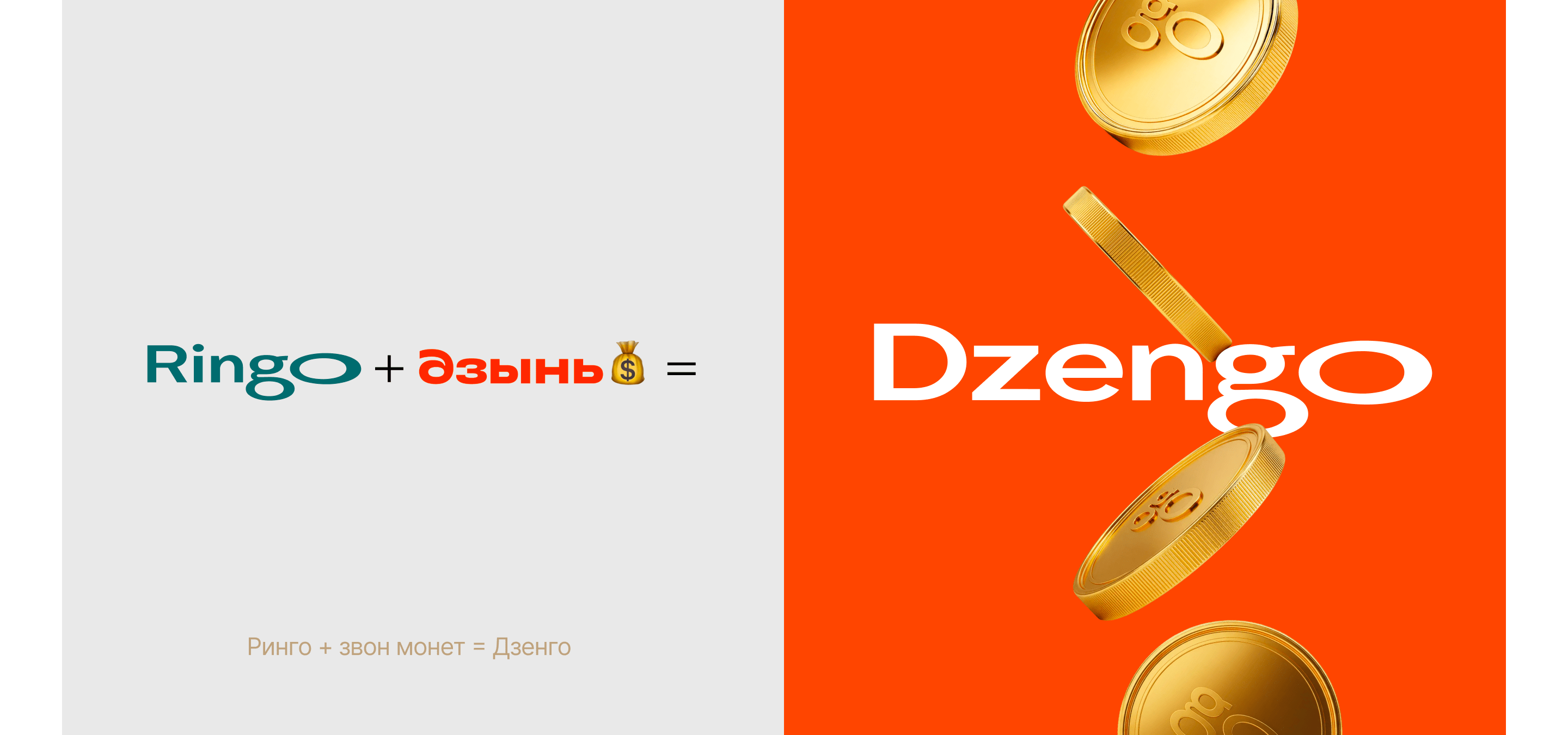 Название проекта родилось из понятной фонетической формулы. Мы взяли узнаваемость и надежность материнского бренда (Ringo) и скрестили его со звуком «Дзынь» — звуком монет, легкости и пришедшего на смартфон пуш-уведомления о зачислении средств. Так получилось емкое, ритмичное и абсолютно цифровое имя — Dzengo.