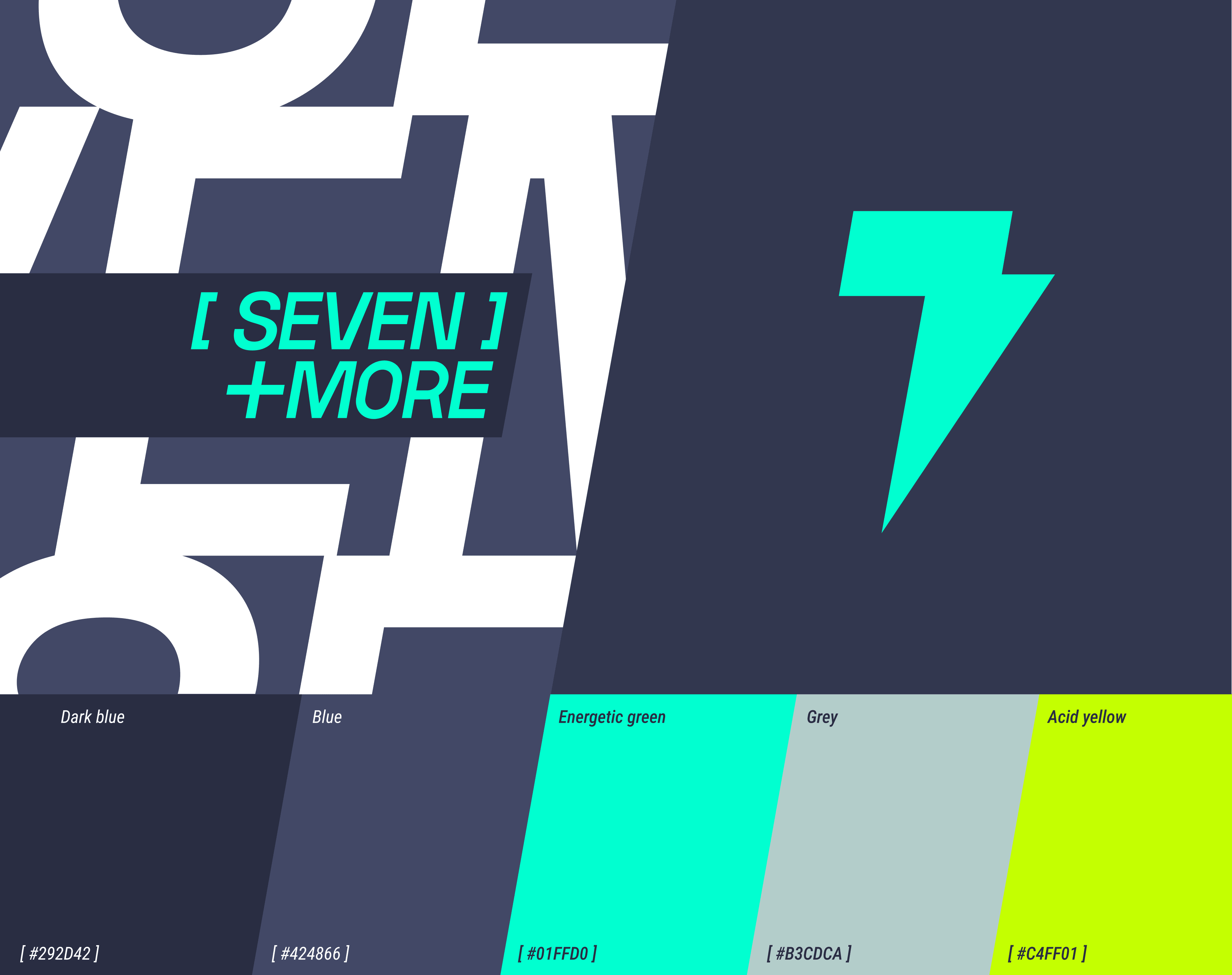 Фирменная палитра Seven — это визуальный заряд, отражающий суть бренда: прогрессивность, открытость и технологичность. Мы собрали контрастные, насыщенные цвета, которые усиливают ощущение энергии и движения вперёд.