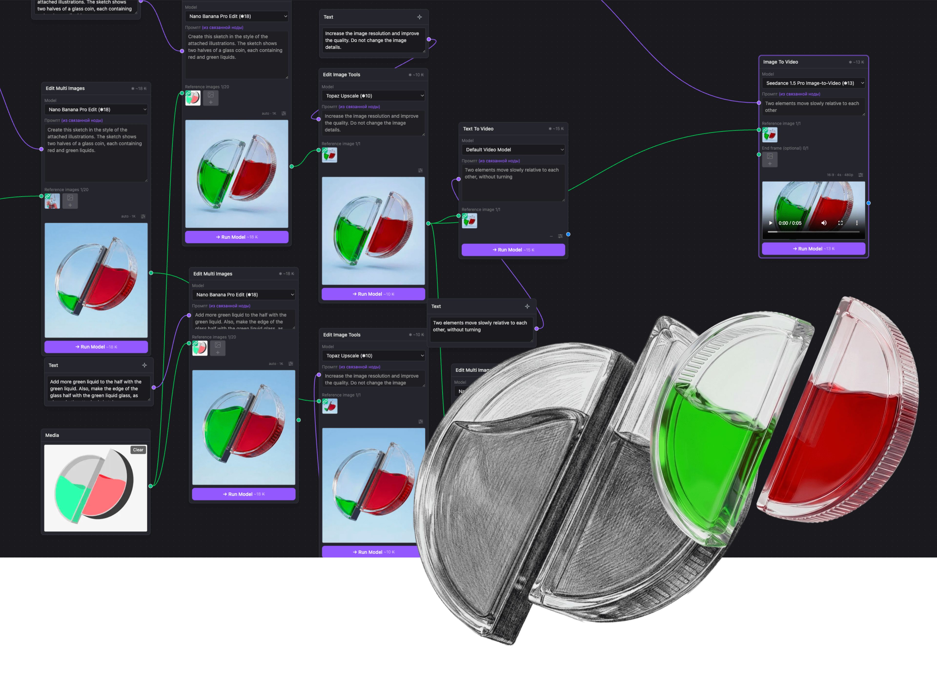 Мы не только используем чужие инструменты. Мы создаём свои — включая RONDO, нодовый движок для построения AI-пайплайнов, который связывает генеративные модели в управляемые цепочки. Разрабатываем продукты для себя и для клиентов.